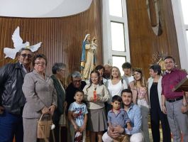 Todos: Virgen María, somos jóvenes y nos parecemos a tu Hijo. Frente a nosotros tu ternura y tu fortaleza; estamos aquí cuando terminamos una etapa del camino. Detrás de nosotros la niñez y la primera juventud, delante de nosotros, la vida. Venimos de todas partes, Tú sabes, pero dentro de nosotros, hay la misma esperanza.