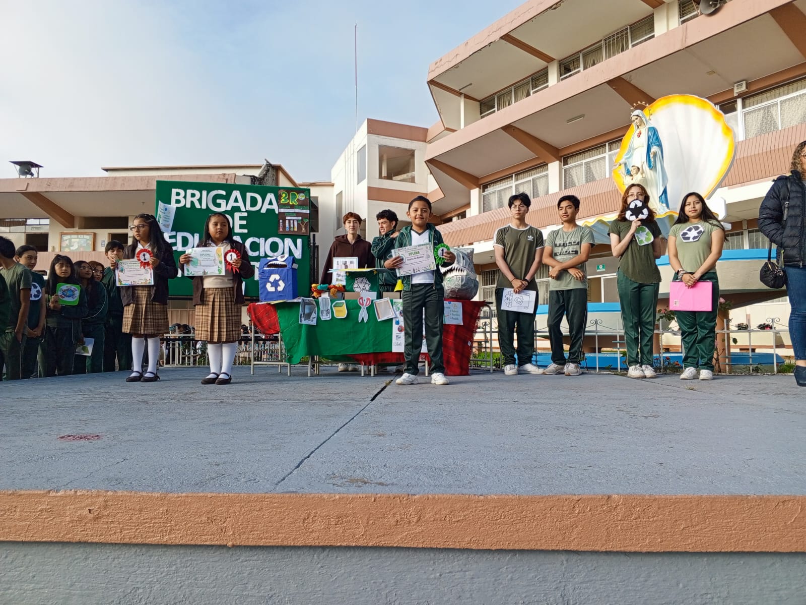 Exposición del Proyecto Huella Verde del proceso de Participación estudiantil y vinculación con la comunidad aplicadas a las Técnicas de Reciclaje y Reforestación 2023-2024. Los participantes apreciaron las diversas técnicas de reciclaje , animando a toda la comunidad a implementar estas prácticas en sus hogares y en su vida diaria. Se destacó cómo el proyecto no solo busca reducir la contaminación y fomentar el amor por la naturaleza, sino también formar líderes competentes con una sólida identidad cristiana-carismática, inspirada en el amor por la naturaleza principios y valores de nuestro Padre fundador “ San Giovanni A. Farina”.
