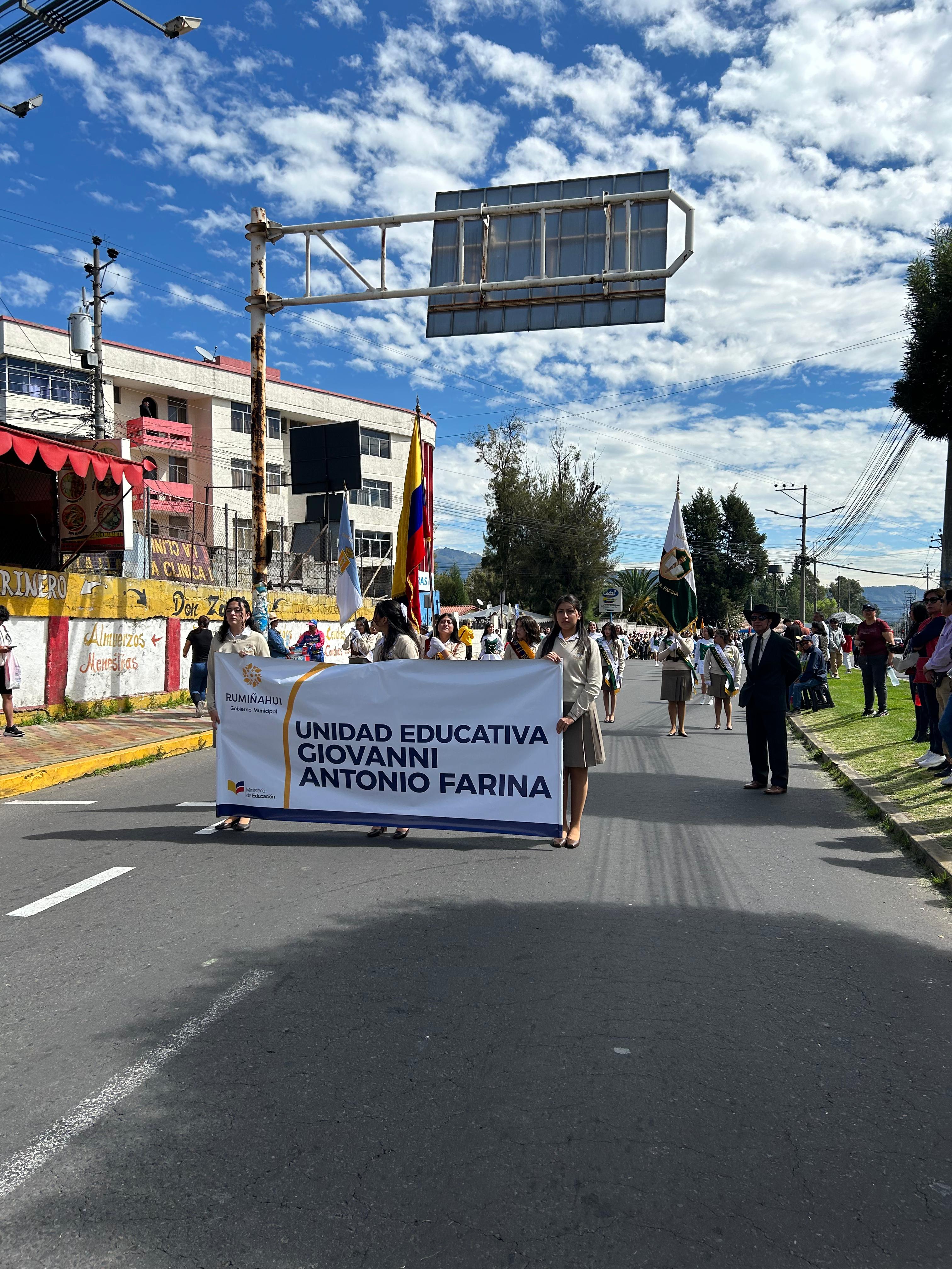 El Cantón Rumiñahui celebra efusivo su octogésimo sexto aniversario de cantonización, motivo por el cual, la Unidad Educativa "Giovanni Antonio Farina", rinde pleitesía con la participación de un grupo selecto de estudiantes, autoridades, docentes, personal administrativo en el desfile realizado la mañana del día de hoy.
