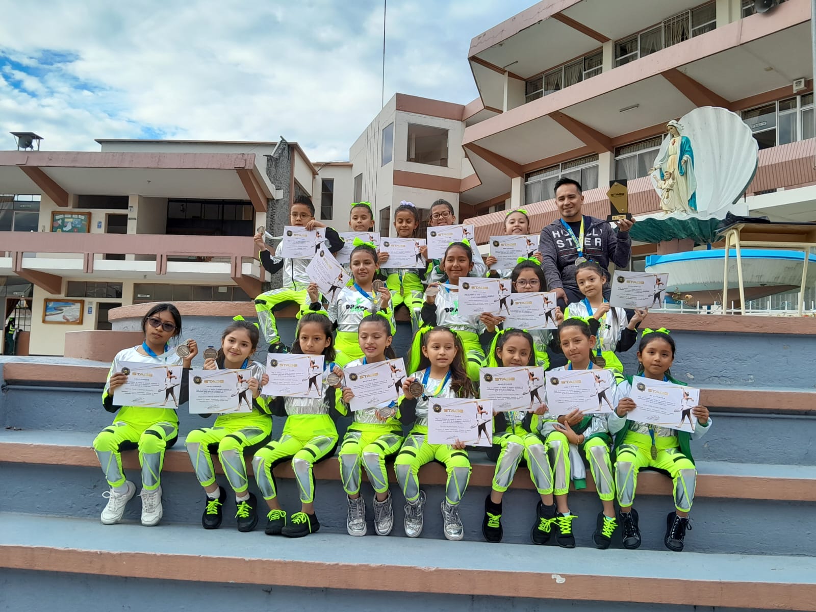 El grupo GAF DANCE lleva un año desde su formación y han demostrado su entereza y disciplina dejando el alma en la pista, en el 2023 fueron el 3er lugar en el intercolegial BAILA sin Límite a nivel Pichincha, en el presente año tienen varias competencias por cumplir, una de ellas se llevó a cabo este domingo 7 de abril en el teatro San Gabriel obteniendo el 1er LUGAR en la competencia STAGE.